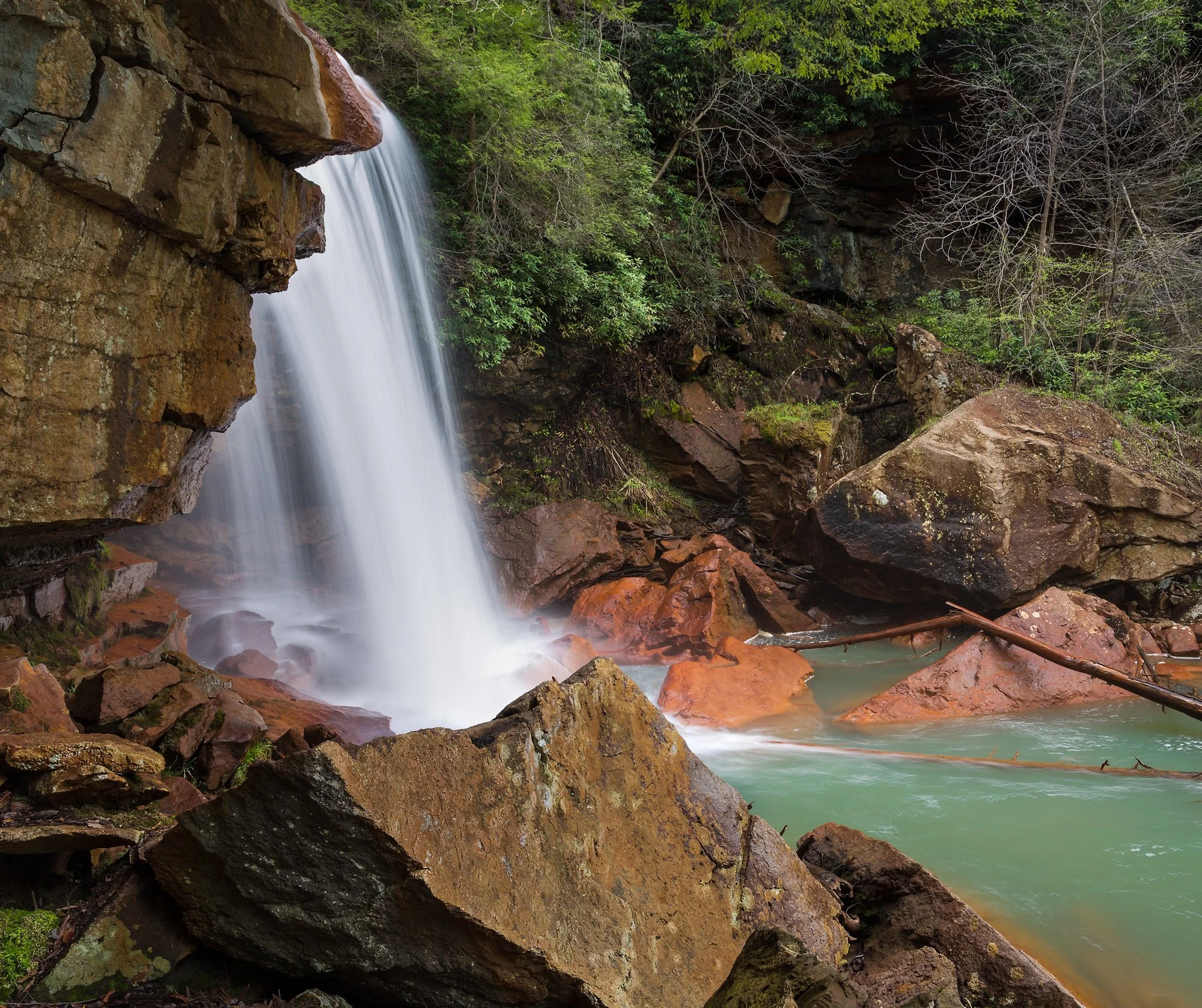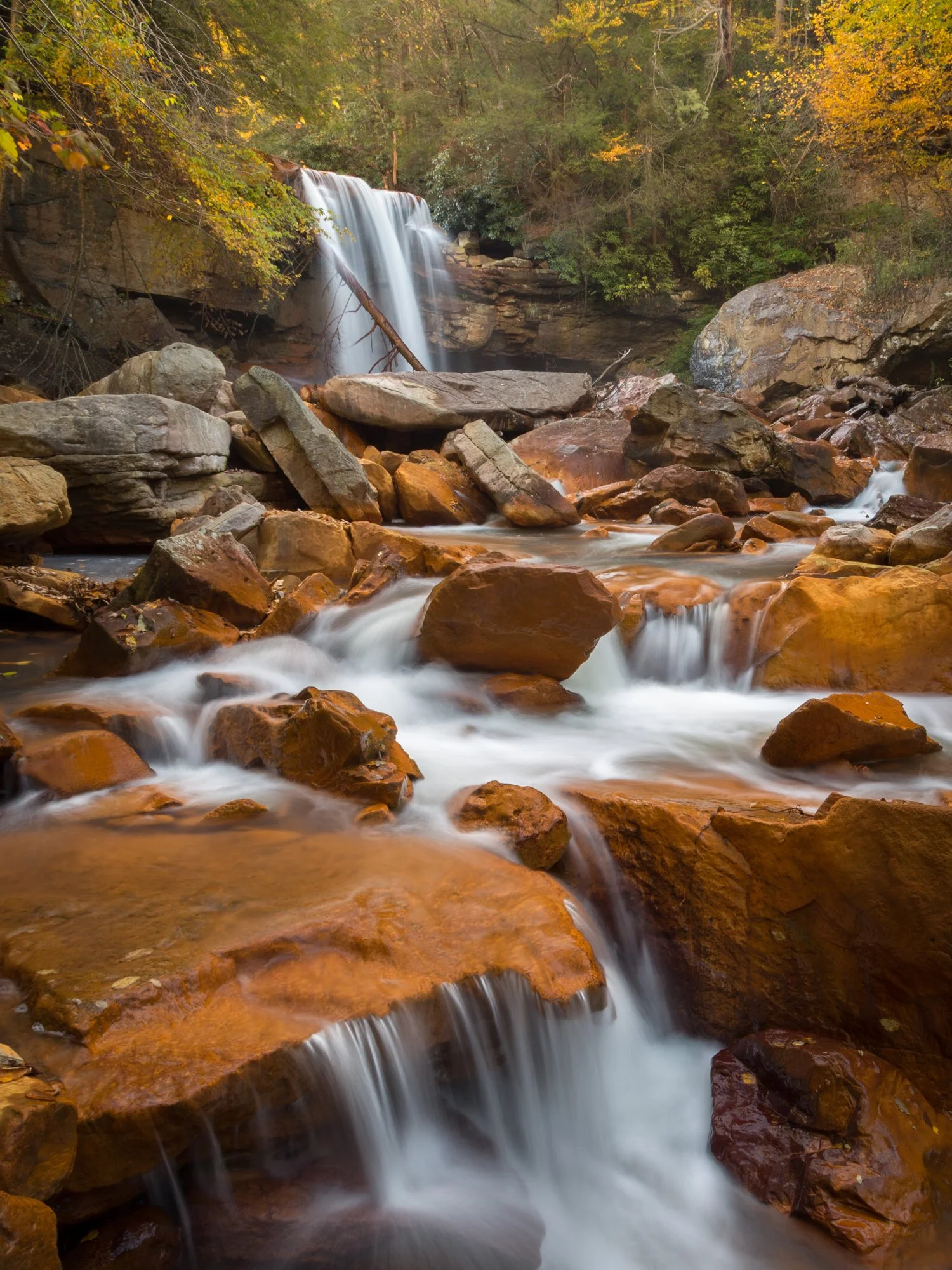 Douglas Falls cascades over a wide sandstone shelf in a hemlock hollow on the North Fork of the Blackwater River near Thomas, and the images made there circulate steadily through the landscape photography community — in portfolios, in social feeds, in workshop itineraries, in photography guides to the region. It isn't hard to understand why. The colors are, upon first encounter, genuinely startling. The rocks are stained deep orange and iron-red. The water, where it pools and cascades, can run aquamarine — a vivid, saturated blue-green that looks, in a photograph, like something from a tropical grotto or a glacial meltwater stream high in the mountains. Together they make an image of almost preposterous beauty. The camera loves it. So do viewers, who have no reason to look further.